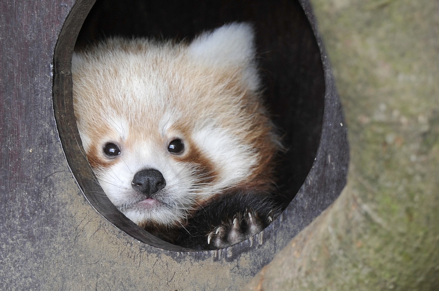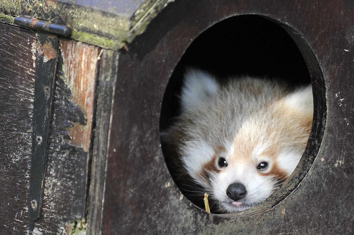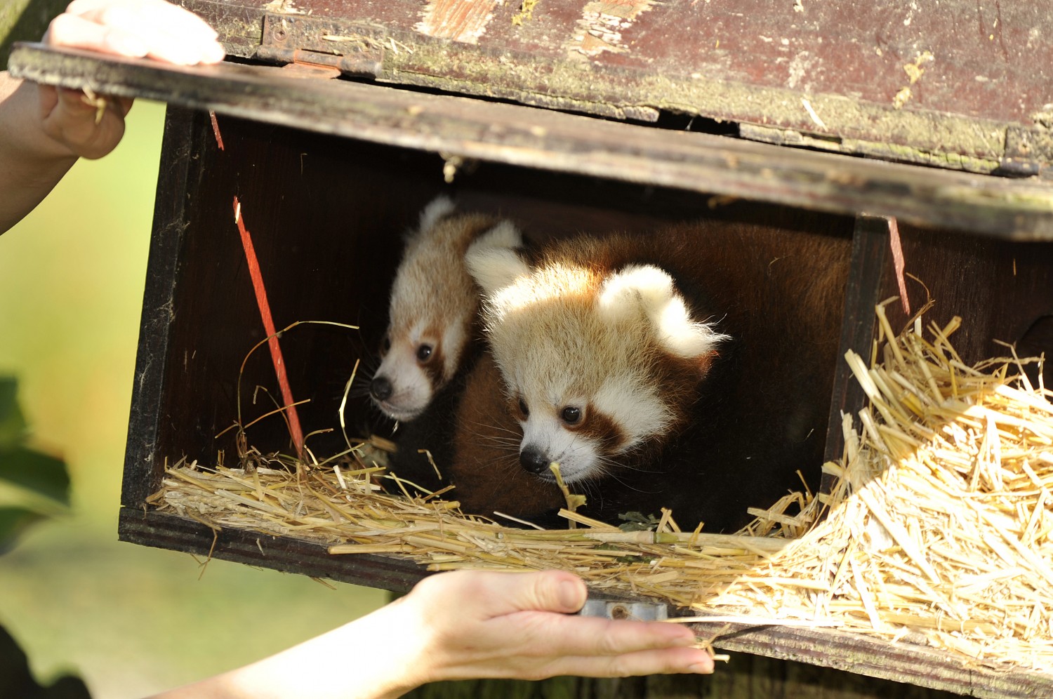 The two Red Pandas were born on 30 June 2015 and have been hiding away in their nesting boxes. This week their six year-old mum Tashi began carrying them outside for short intervals.